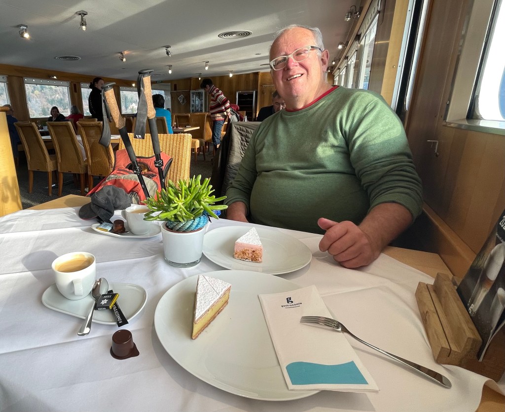 Da wir auf dem Stoos keinen Kaffee trinken konnten, genehmigen wir uns jetzt einen Kaffee und ein Stück schön feuchte Zuger Kirschtorte.