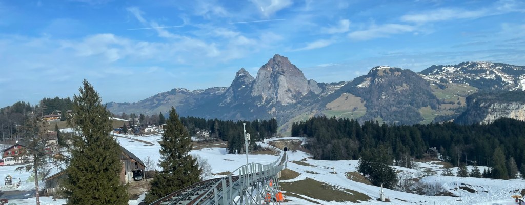 Noch hat es auf dem Stoos genügend Schnee um Skifahrern zu können. Um es wenigstens etwas winterlich aussehen zu lassen, wurde der Vorplatz zur Bahnstation trotzdem mit Kunstschnee, der nun langsam schmilzt und pflotscht, eingedeckt.