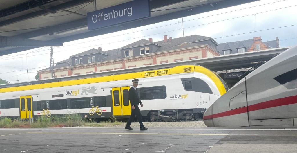 Um 9:27 Uhr fahren wir in einem RE nach Offenburg. Dieser Bahnhof macht noch immer beziehungsweise immer wieder einen sehr heruntergekommenen Eindruck.
