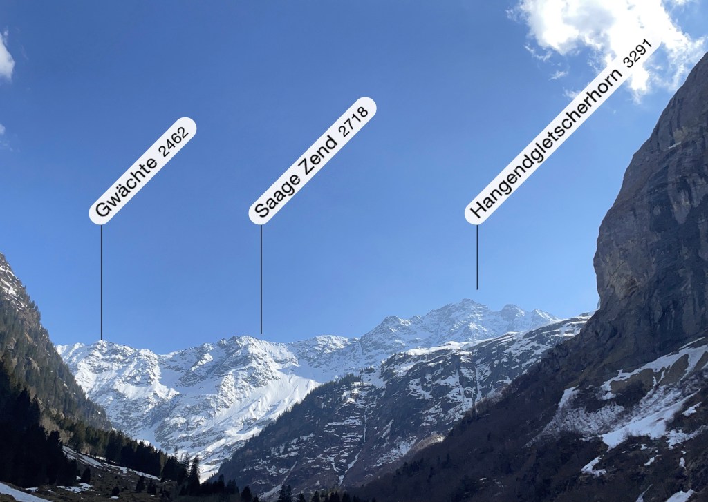 Dort oben, über dem südlichen Ende des Tals, liegt das Hangendgletscherhorn, auf dessen Südseite der Gauligletscher liegt.