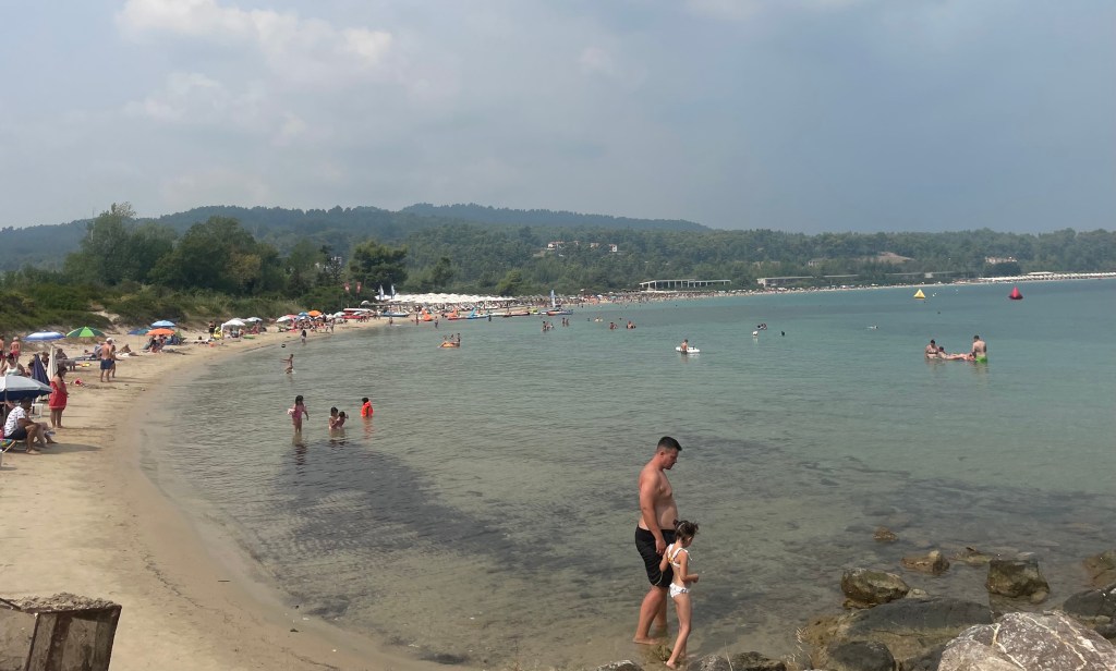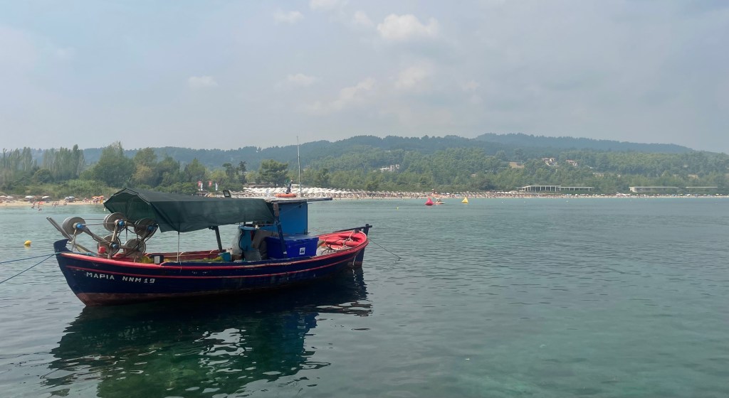 bis Nea Skioni, zu einer schönen Taverne an einem Sandstrand auf der viel weniger dicht bevölkerten Westseite der Halbinsel Kassandras.