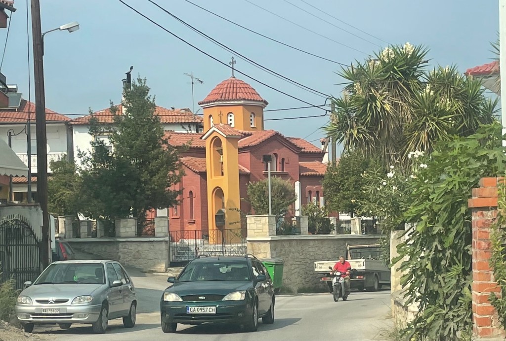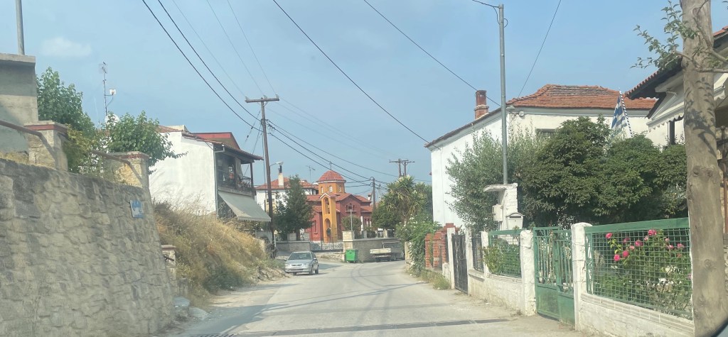 Michali fährt in Kryopigi von der grossen Strasse ab, durchs alte Dorfzentrum. Es wurde viel kaputt gemacht, neue Bauten die einfach nicht hierher passen.