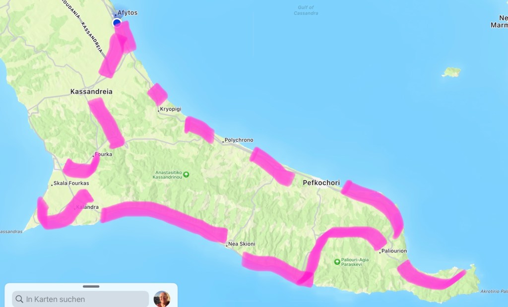 Yvonne und Michali wollen uns heute die nähere Umgebung zeigen. als wir unterwegs sind kommt aus, dass daraus eine Rundfahrt über den südlichen Teil der Kassandra Halbinsel wird.