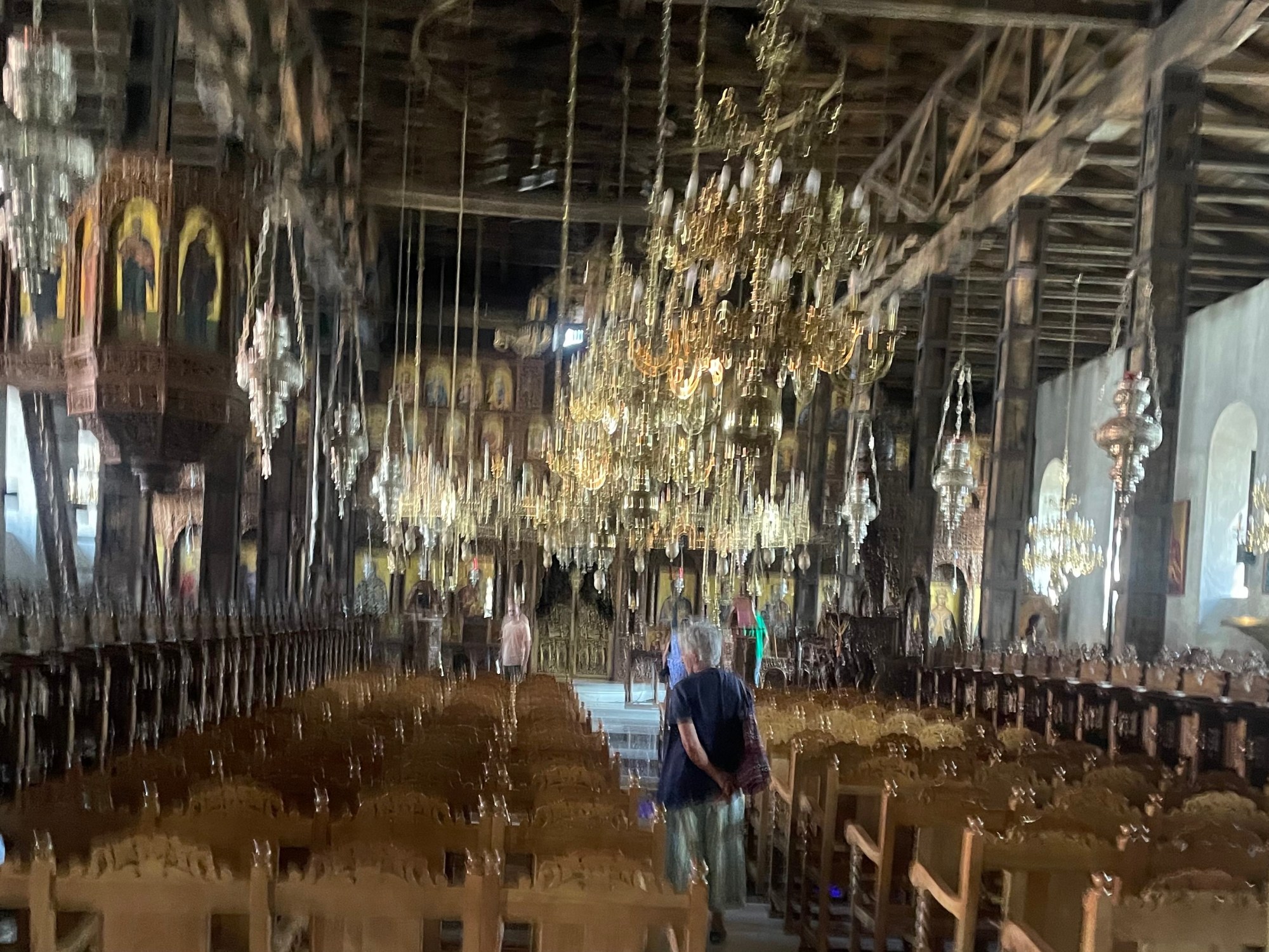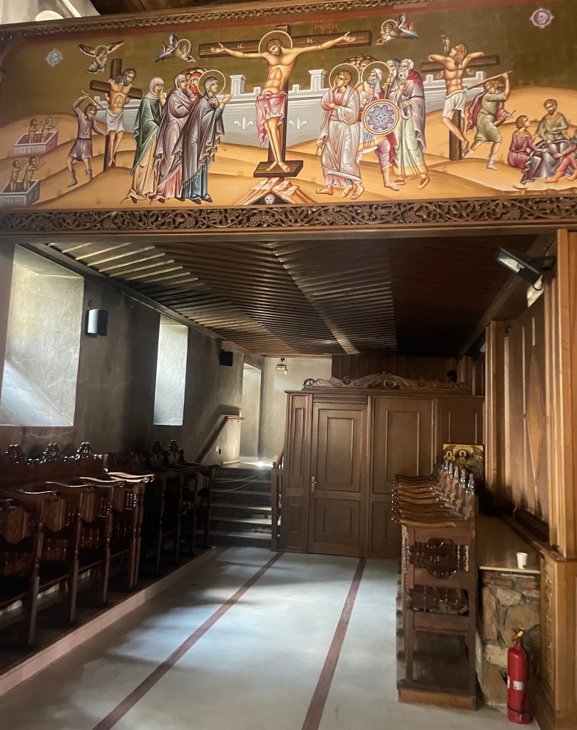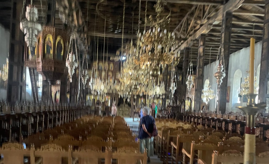 Reich geschmückte Kirche, teils mit Glasboden, so dass die Ruinen der früheren Kirche gesehen werden können.
