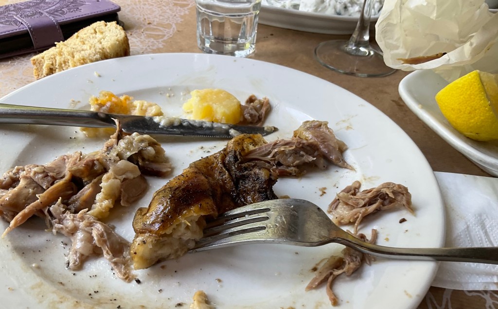 …. wo wir nach diversen Vorspeisen, bald ein herrlich mundendes Lammgigot serviert erhalten.