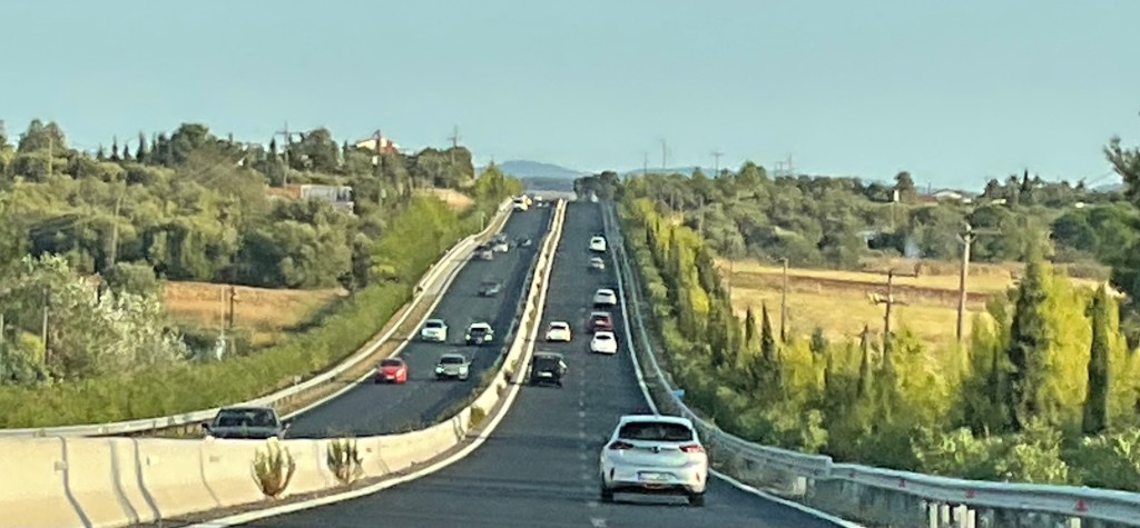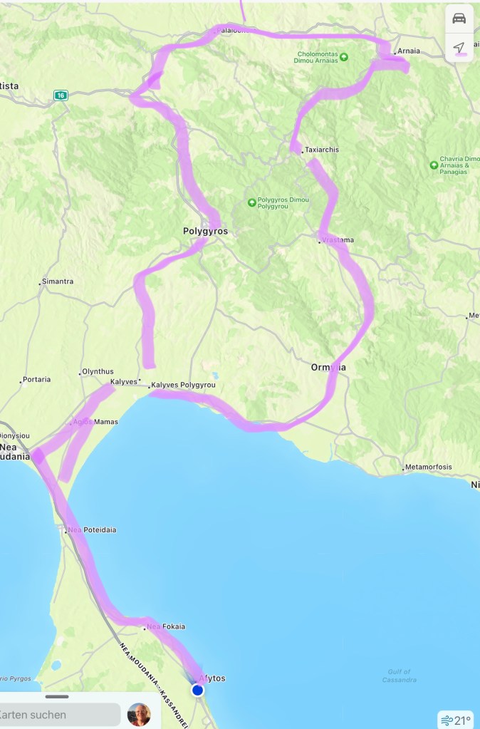 Um möglichst rasch Richtung unser Ziel zu kommen, fahren wir auf der Autostrasse beziehungsweise Autobahn nach Nea Moudania. Ab hier fahren wir Richtung Osten und dann auf einer Nebenstrasse nach Norden, Richtung Polygyros