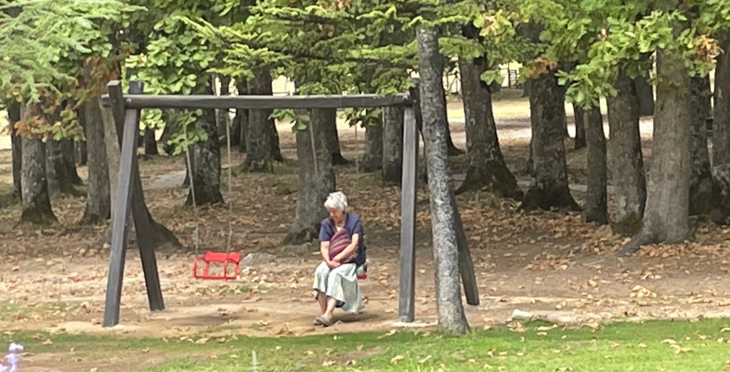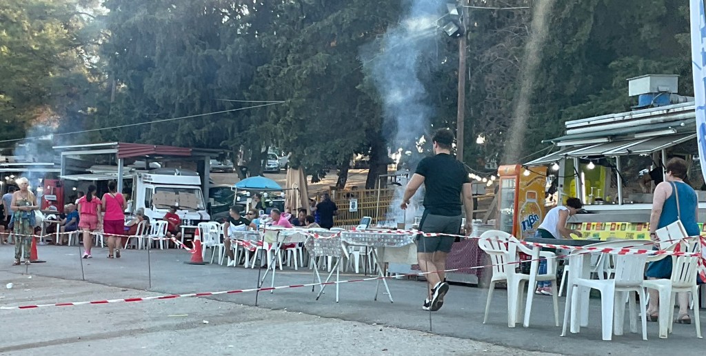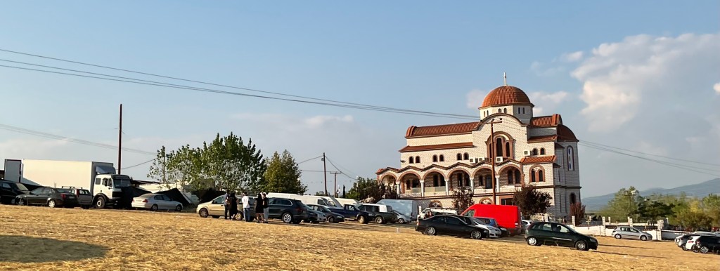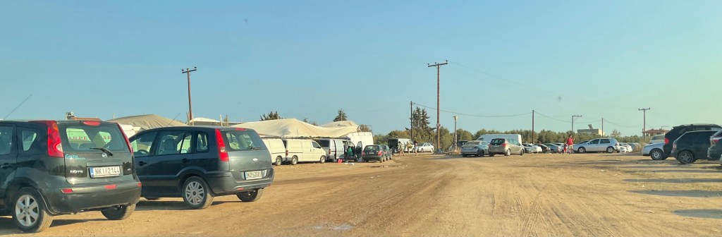 Anstatt auf der grossen Strasse über Nea Moudania heimzufahren, will uns Michali die Jahrmarktstimmung in Agios Mamas vorführen. Wir sehen allerdings nur ein paar Souvlaki stände und vor allem eine Unmenge an Autos auf abgeernteten Äckern.