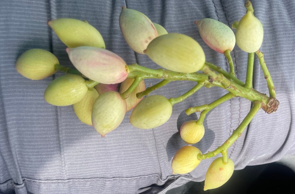 Ich habe die Bäume nicht gerade sofort erkannt und frage nach. Also hält Michali an und pflückt mir einen Zweig, noch grüner unreifer Pistazien, die einen herrlichen leicht harzigen Duft verbreiten.