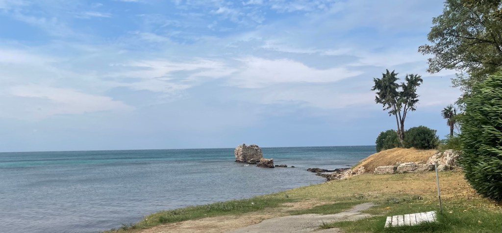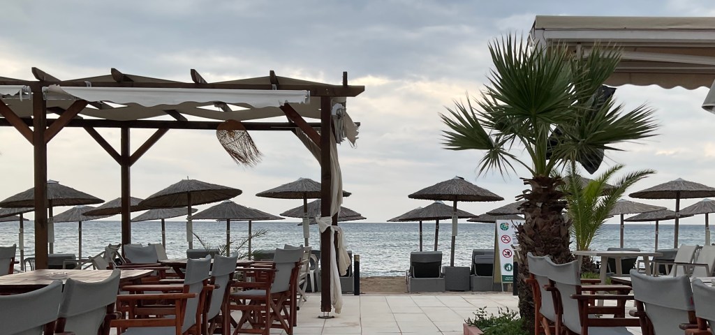 Zum Kaffee den es hier auf dem Dorf nicht gibt, fahren wir an den Strand: Paralia Dionysiou etwas nördlich von Nea Moudania.