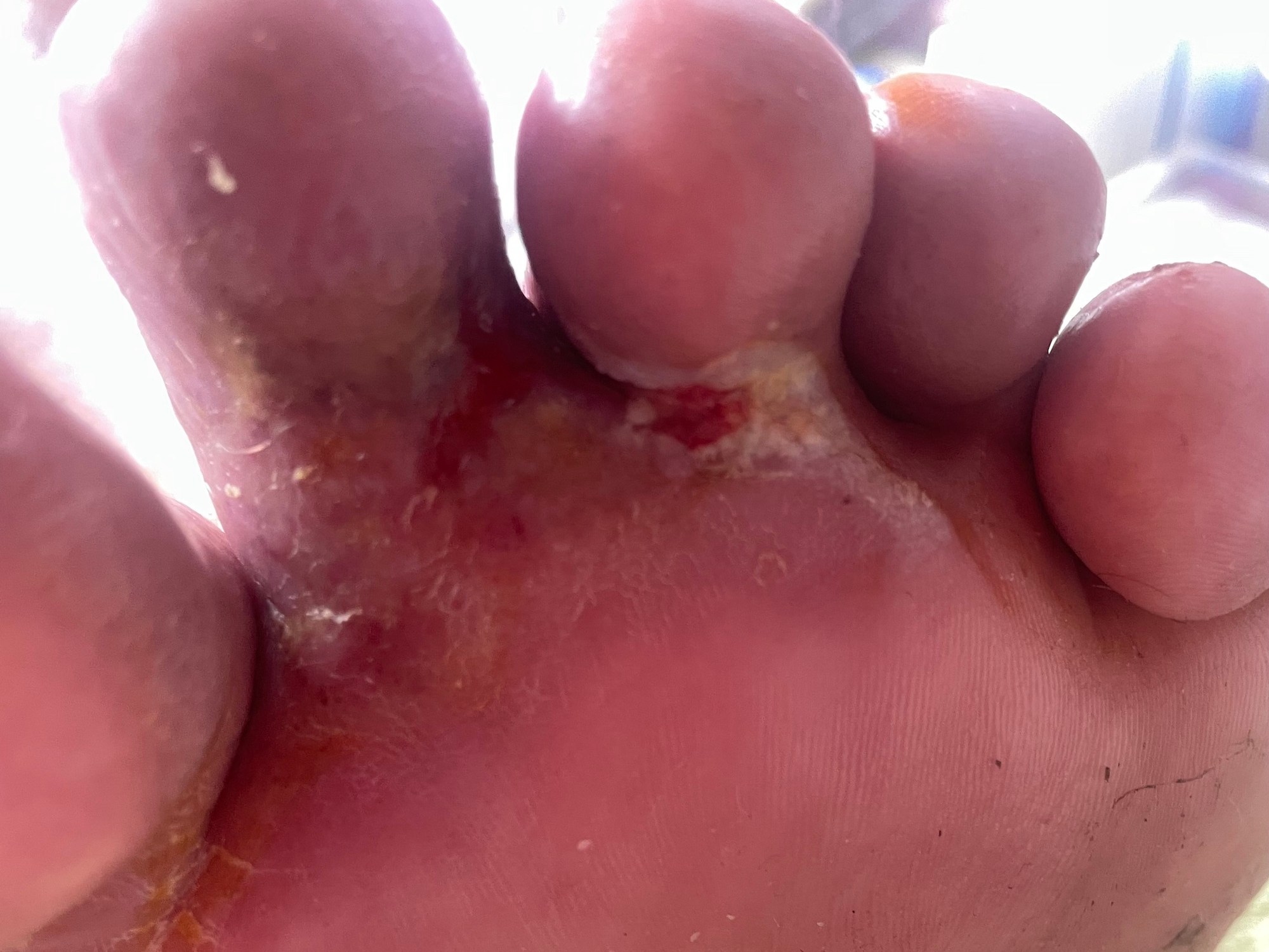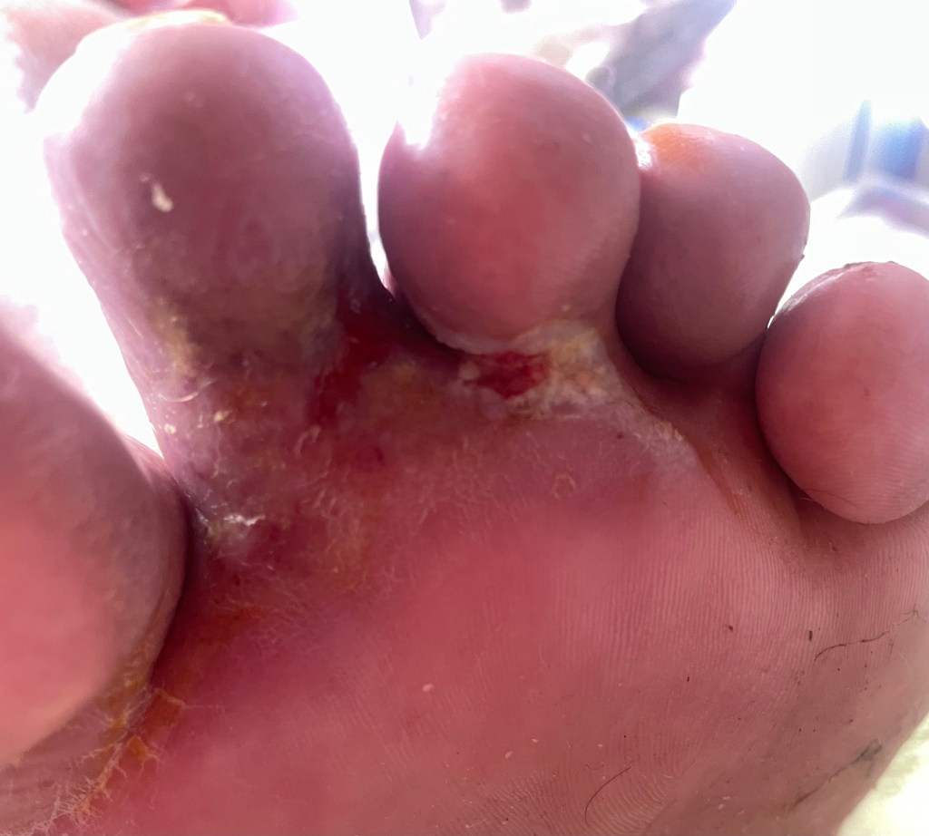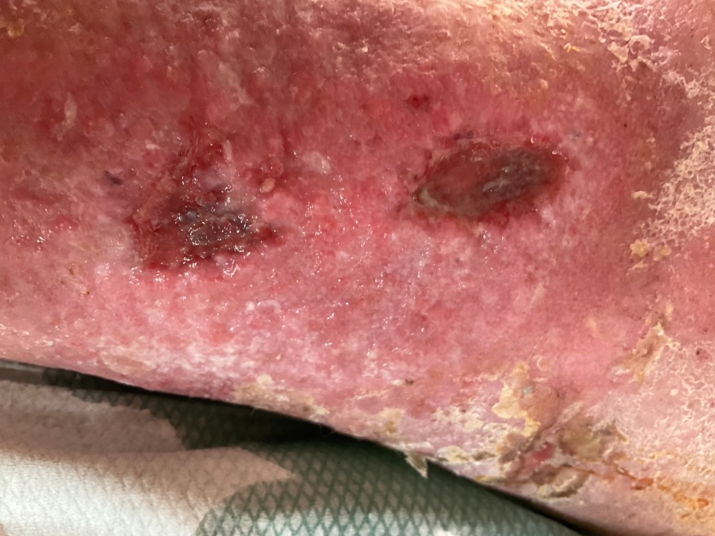 Im neuen Jahr verlasse ich die Wohnung nur noch selten, die Wunden schmerzen immer mehr. Zudem verliere ich tageweise Lymphenflüssikeit von bis zu einem Liter. Mehrere Paare Sandalen habe ich schon kaputtgemacht, Schuhe kann ich schon seit August nicht mehr tragen, ebenso wie Socken.