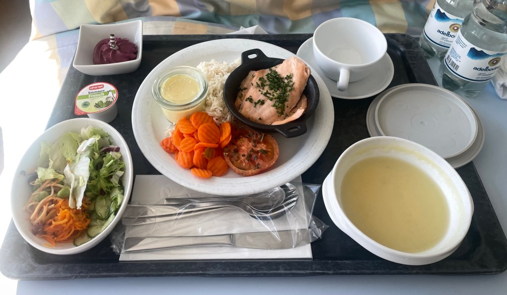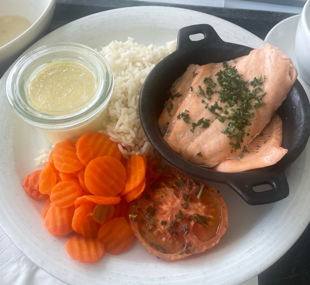 Cremesuppe, gemischter Salat (ich verzichte auf Salatsauce), Lachs mit Reis gedämpften Karotten und gegrillter Tomate.