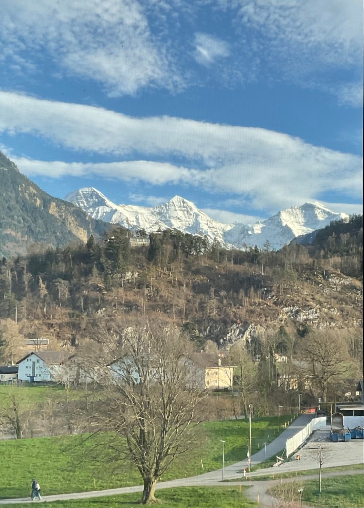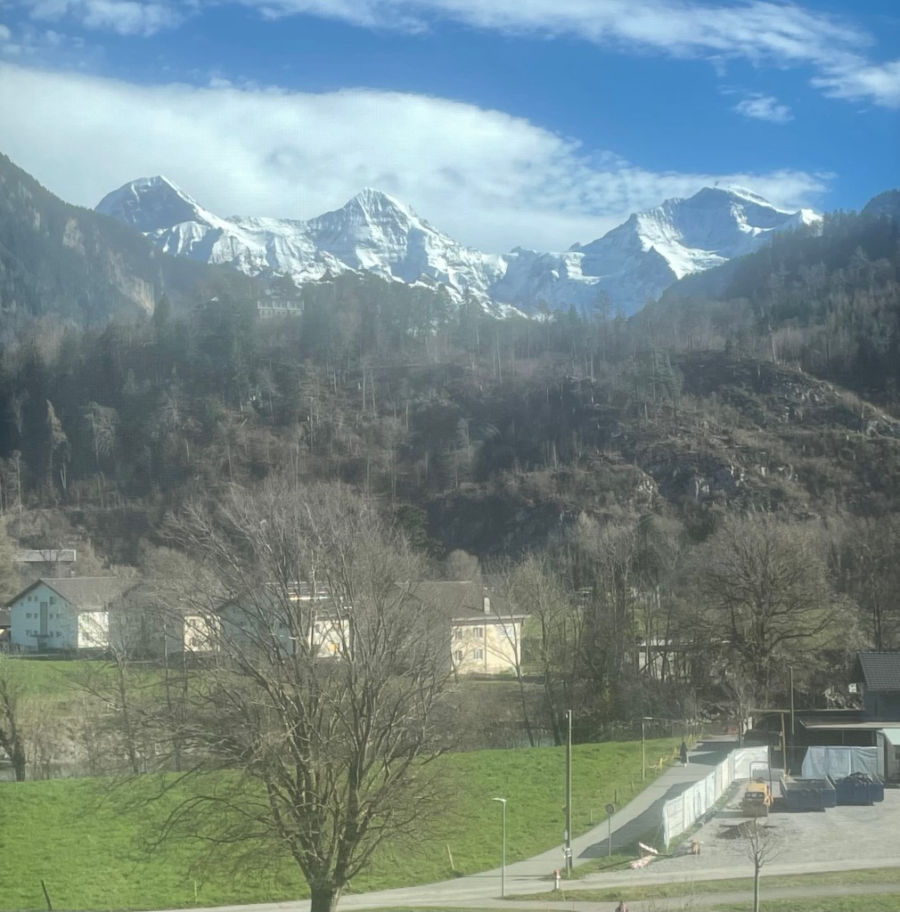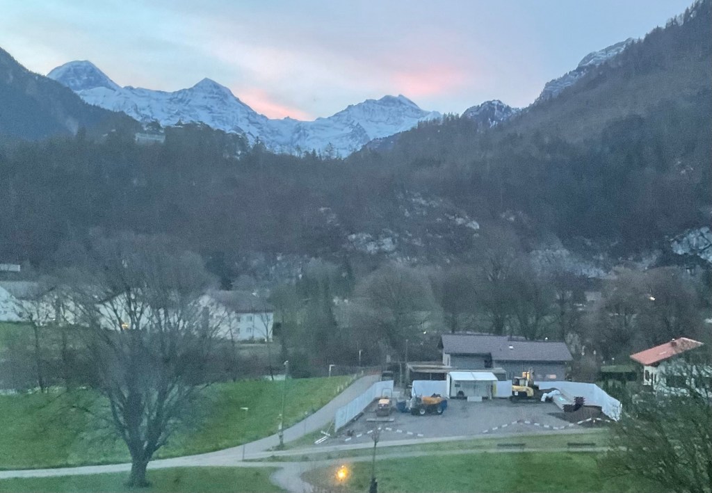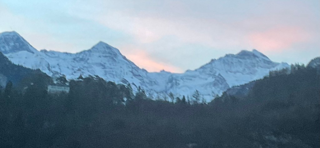 Kurz nach 7 Uhr kommt endlich Bewegung in die Sache. Ich verlasse in meinem Bett liegend und ohne weiteres Dazutun mein Einzelzimmer mit Blick auf das schönste Dreigestirn der Bergwelt, Eiger, Mönch und Jungfrau.