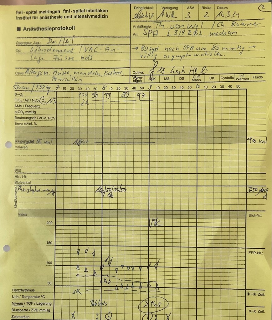 Ich schätze mich glücklich, dass ich einen kurzen Blick auf das Operationsformular und das Anästhesieprotokoll werfen kann.