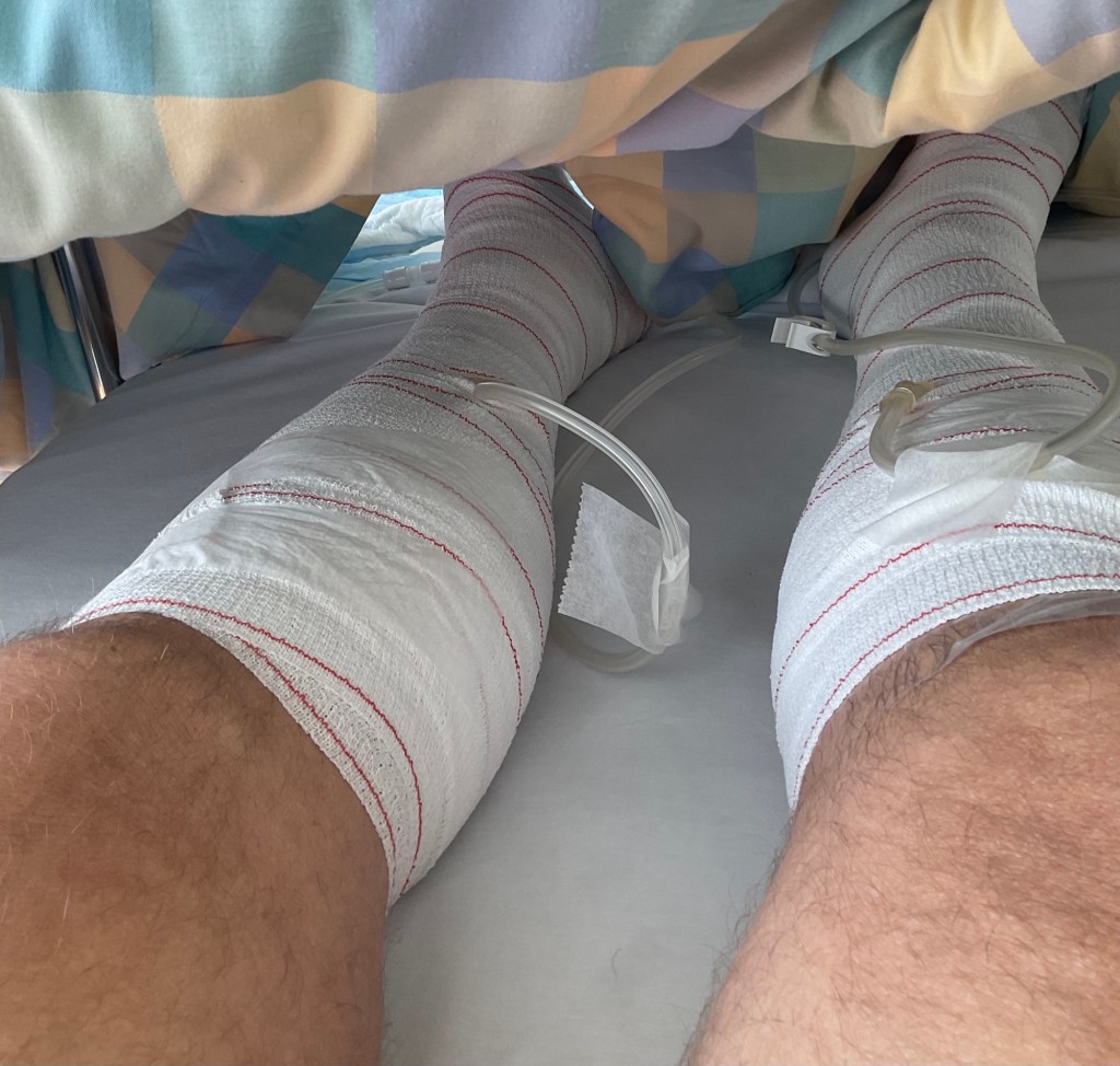Meine Füsse und Beine sind dick einbandagiert. Je ein Schlauch führt hinaus, worin Wundsekrete und Lymphenflüssigkeit mittels Vakuum abgeführt werden.