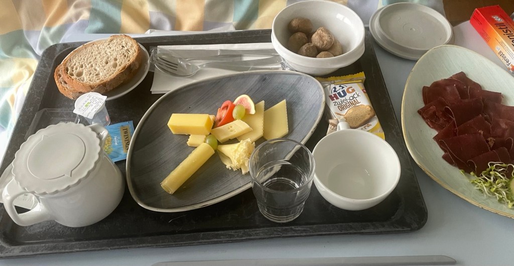 Um 18:00 Uhr erhalte ich das offizielle, für mich ist sehr reichhaltige Abendessen. Trockenfleischteller, gemischter Käseteller, Gschwellti, Brot, Zwieback, Fencheltee und jede Menge Pillen.