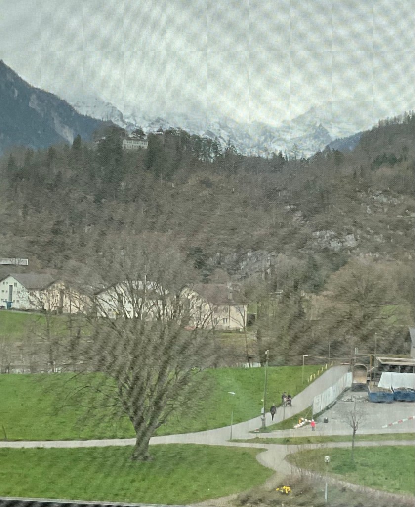 10 Uhr, heute scheint eine fahle Wintersonne. Die drei einigen Berge Eiger, Mönch und Jungfrau sind Nebel verhangen und nur teilweise zu sehen.