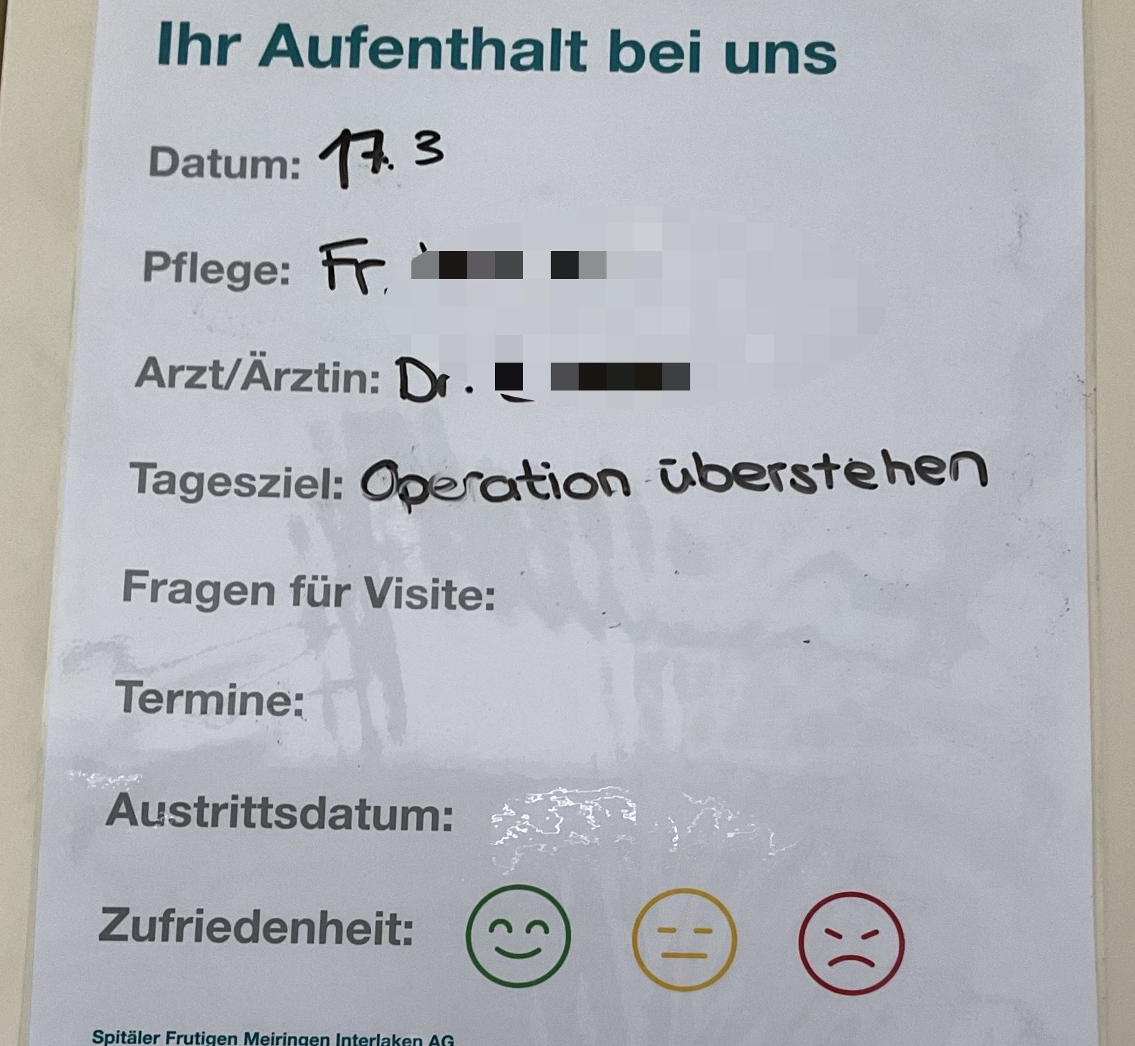Dieses penetrante Nachfragen und darauf Bestehen, dass ich ein Tagesziel haben muss, das der Pflege dann auch noch genehm ist, stört mich immer wieder. Mein Tagesziel ist: Operation überstehen! Diese meine Aussage wird vorerst nicht akzeptiert. Erst als ich darauf bestehe und antworte dass ich sonst bei diesem Spielchen nicht mehr mitmachen würde, werden 2 Worte »Operation überstehen« notiert.