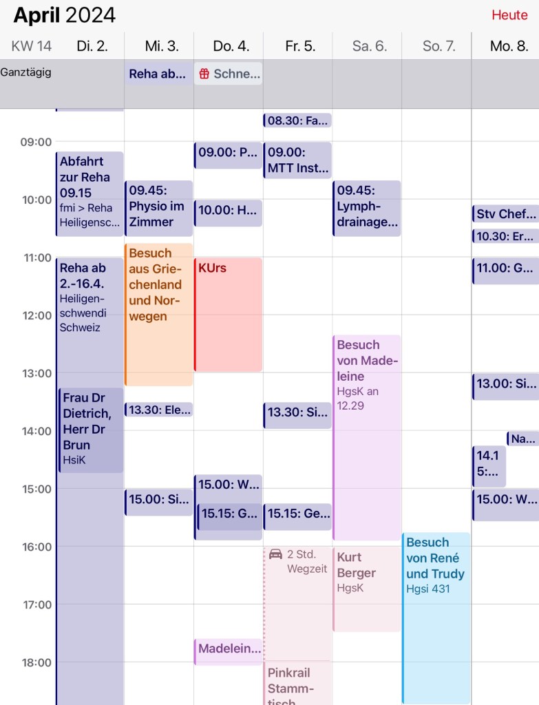 Der Termin– beziehungsweise Therapieplan für diese Woche sieht locker aus, zu locker! 3-5 Mal eine halbe Stunde trainieren ist wenig, zumal nur unter Aufsicht trainiert werden kann und Therapeuten hin und wieder mal zu spät kommen.