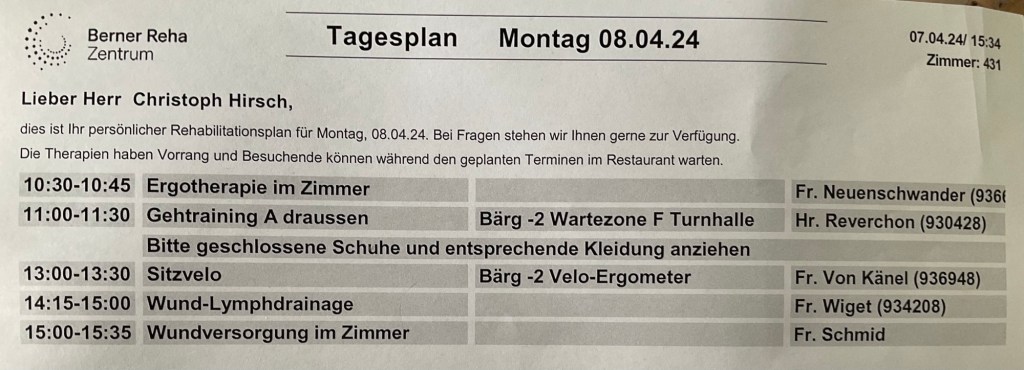 Nur gerade zwei Übungen ausserhalb des Zimmers, das ist schon sehr sehr wenig! ich darf aber nichts sagen, sonst würden mir (wie mir ein ‚Leidensgenosse‘ der mit der ganzen wischi-waschi-Rehabilitation hier nicht sehr zufrieden ist) noch weniger Übungen beziehungsweise Trainingseinheiten verordnet.
