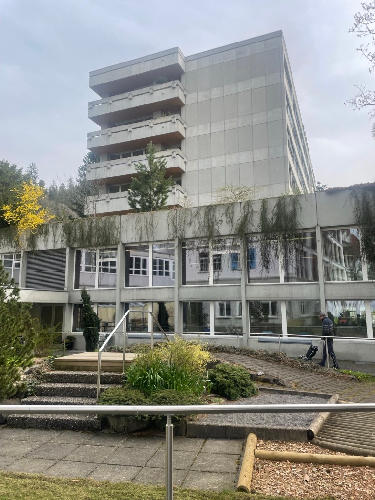 Das Gehtraining findet zwischen dem grossen grauen Betonblock des Kurhauses und dem ältesten Gebäude der Höhenklinik statt. 80 Meter Rundgang an der frischen Luft.